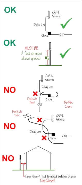 reco1SMend a tuner if you want maximum bandwidth and convenience. These antennas MUST be located a minimum of 5 feet from the ground in order to operate efficiently! 10 feet minimum is recommended. They MUST be farther than 4 feet from the nearest vertical metal object when mounted. The delay line MUST NOT cross the output connection of the choke coil. That is, the delay line coax cannot be laying on or over (touching) the output of the choke coil coax connection. This is true even if you have a choke in a box. The choke coil must not have its input and output coax cables laying over one another. This will cause the choke to be partially bypassed due to slight capacitance of the coax jackets and the result will be unstable SWR. Any conductive object near it will tend to detune it slightly. Most of the time this is not a problem and will show up as minor SWR changes. But allowing your coax lines to lay on top of each other and cross over each other will cause the delay line to partially couple to other coaxes and their connections causing strange SWR problems. You shouldn't coil the delay line up over itself, instead lay it out in a lazy S pattern to spread it out. And don't let your choke output lay over other incoming coax connections. A typical installation is a 10 foot antenna mast made of metal, 1 to 1.25 inch's in diameter with the antenna sliding down over the top of the mast. The antenna has a stop bolt inside its mounting pipe to prevent it from sliding down too far. You can simply slide it down and forget it. Or you might want to drill a hole in your mast and use the stop bolt to bolt it to the mast so it won't turn but this is not necessary. On the output side of the choke, you can connect any length of 50 ohm coax you wish to your transmitter. A tuner is required for the 40,80 and 160 meter antennas if you want to cover the whole band and is recommended for all bands to make operation easier. Unlike other antennas, swr variations do not effect the performance of these antennas. (on the band of operation) Field strength measurements prove this, but you should always keep the swr low for transmitter efficiency and maximum power transfer. Download this Instruction Page here. Right click and choose 'save as'. |